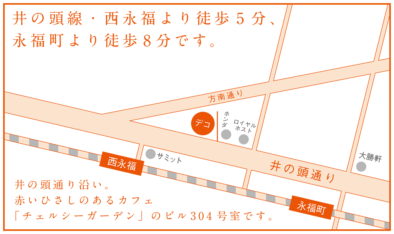 デコ有限会社 〒168-0064 東京都杉並区永福4-18-1 プラスハウス304 電話:03-6265-8750 ファクス:03-6265-8751 メール:info@deco-tokyo.com